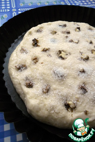 Подошедшее тесто обмять и выложить в смазанную форму, растянув в лепешку. Растопить оставшиеся 20 гр. масла и смазать поверхность лепешки. Вдавить в нее порубленные грецкие орехи и посыпать сахаром. Оставить в тепле еще на 20 минут.