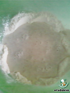 Муку просеять в миску, сделать углубление, в которое насыпать дрожжи и сахар. Развести их тёплым молоком, постепенно смешивая с мукой. Поставить в тёплое место минут на 15 до увеличения объема.