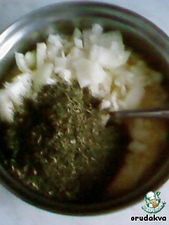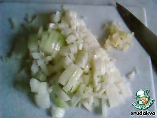 Лук и чеснок очистить. Лук мелко порезать, чеснок продавить через пресс.