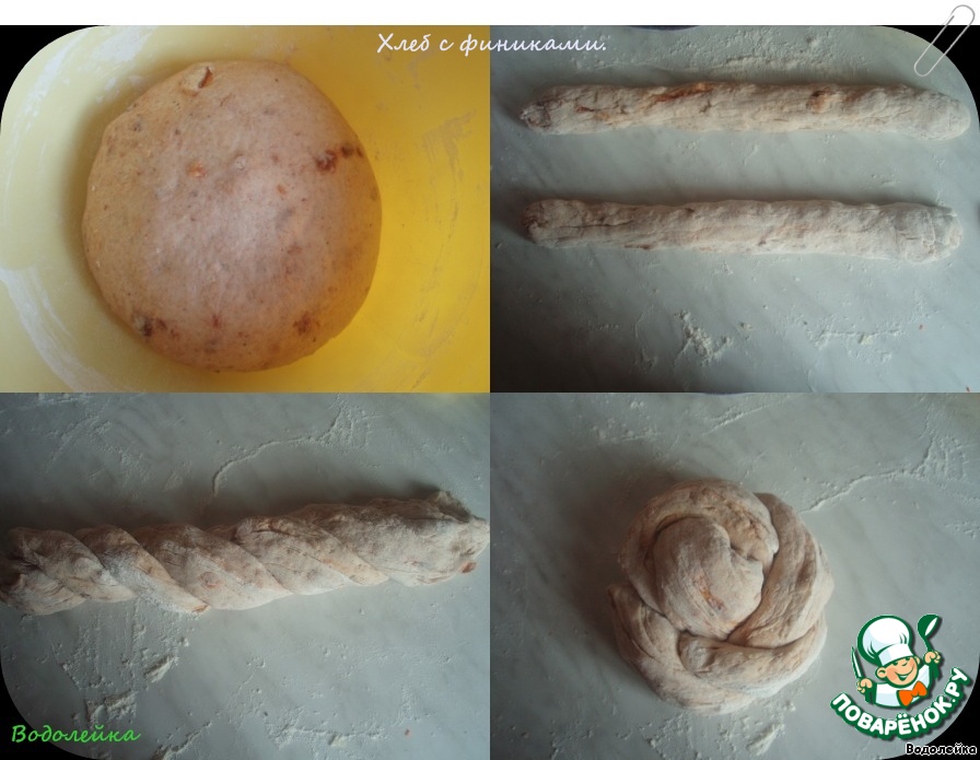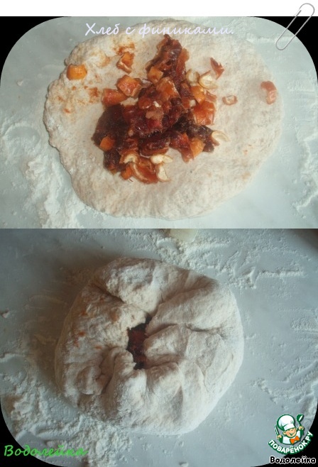 Края теста заворачиваем к середине (как на фото, почему именно так? просто тогда финики не выпадают)) и начинаем вмешивать финики в тесто. Это занимает не очень много времени, буквально несколько минут.