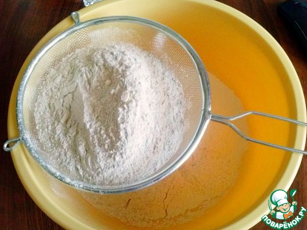 Рецепт хорош тем, что делаем сразу тесто, без опары. Просеем 2 вида муки, добавим дрожжи