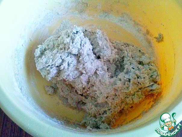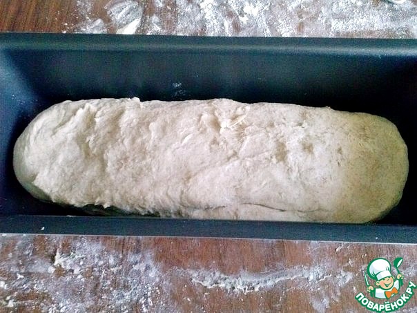 Следующий шаг был для меня самым проблемным, так как опыт в замесе у меня небольшой, я начиталась советов какого-то заграничного шеф-повара, что тесто нужно именно растягивать, как бы пуская туда воздух. И муки для присыпки самую-самую малость, что бы тесто не забивать. Берете тесто с двух сторон руками, как вилками (его слова), и складываете его, и так месить пока тесто не станет эластичным. Сразу оговорюсь, что это тесто не будет эластичным, я его месила минут 10-15, первые минут 5 боролась без муки, потом чуть присыпала, опять месила липкую массу, и потом присыпала в самом конце, чтобы чуть сформировать и убрать на расстойку. Пишу так подробно для тех, кто так же, как я, еще не имеет большого опыта. Фууух)) Переложила в смазанную раст маслом форму и поставила подходить в теплое место.