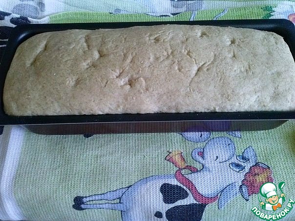 Я его опять обмяла, и оставила еще на 40 минут. Вот так оно подошло. (Сейчас заметила, что даже корова с полотенца удивленно смотрит-Надо же, у нее получилось!)) Смазала молоком и поставила в разогретую до 200 градусов духовку на 35 минут ( в оригинале 40 мин)