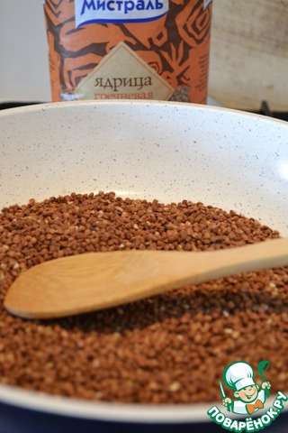 Гречку (я использовала ТМ "Мистраль") обжарить на сухой сковороде (5-7 мин.), постоянно помешивая.