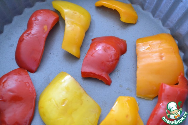 Болгарский перец запечем при 200 градусах 10-15 мин. с одной стороны, затем перцы перевернем и еще отправим в духовку на 10-15 мин. Затем сложим перцы в полиэтиленовый пакет на 10 мин. Через 10 мин. снимем с перцев кожуру и мелко нарежем.
