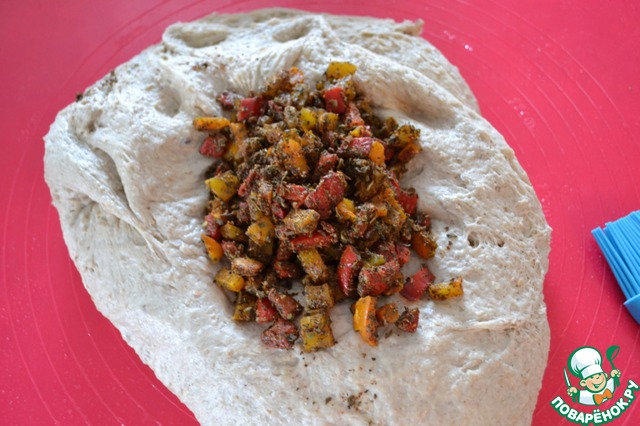 Выкладываем тесто на стол, добавляем начинку и хорошо перемешиваем тесто (если липнет к рукам, то смазать руки растительным маслом)