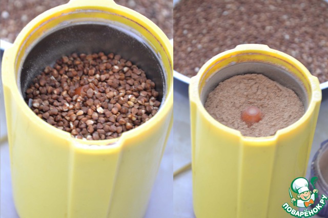 С помощью кофемолки перемолоть крупу и дважды просеять.