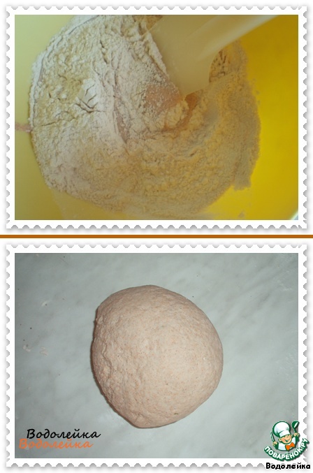 Дальше делаем так называемое "серое" тесто. Почему серое??? Да все очень просто. В состав теста кроме пшенички высшего сорта входит пшеничная обойная мука (это мука грубого помола), вот она и придает тесту как бы сероватый цвет. Но в этом нет ничего страшного.