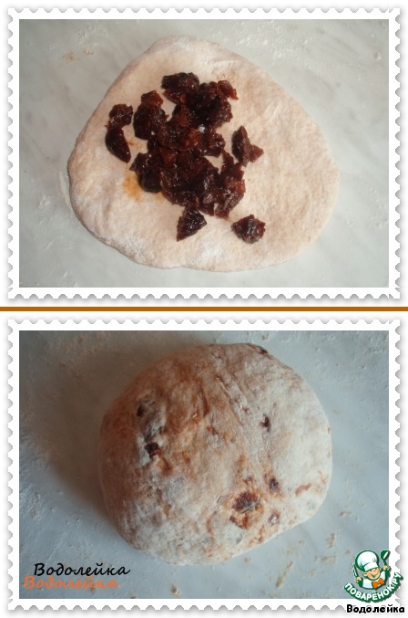 В конце из теста сделать круг и выложить на него наш чернослив (предварительно слить ром и дать черносливу немного стечь). Края теста по кругу завернуть к центру. Начинаем как бы вмешивать чернослив в тесто. Продолжать месить, пока чернослив равномерно не вмешается в тесто. Возможно на этом этапе понадобится добавка муки (пшенички высшего сорта), т.к чернослив все-таки был замочен.
