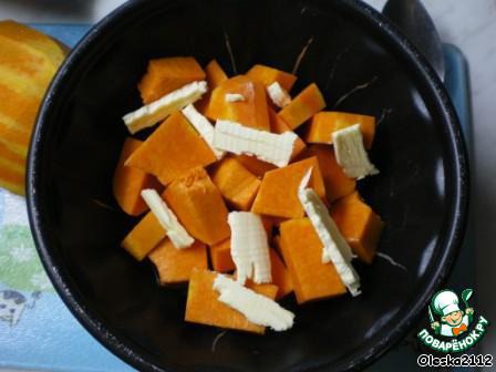 Тыкву нарезать небольшими кусочками, сложить в сковороду или огнеупорную форму, положить небольшие кусочки масла (немного от общего количества), посыпать сахаром (немного), добавить 3-4 ст.л. воды и поставить тушить в духовку до мягкости.
