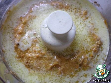 Всыпаем смешанную с содой и солью муку в пюре, добавляем растопленное сливочное масло, корицу, сахар (оставшийся), яйца и апельсиновый сок. Всё тщательно перемешиваем миксером или как я - в процессоре.