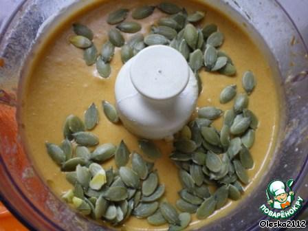 Тесто должно быть по консистенции как густая сметана. Вводим в тесто обжаренные тыквенные семечки. Всё перемешиваем ложкой.
