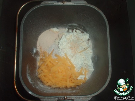 | Предлагаю еще один хлеб все из той-же книжечки "Рецепты для хлебопечки". Хлебчик получается вкусный, вкус сыра более преобладает, чем вкус творога. Сегодня утром делала из него тосты, вкуснота, да и только. |