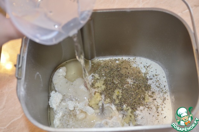 В чашу хлебопечи выложить муку, дрожжи, соль, сахар, растительное масло, приправу - у меня «Итальянские травы». Выдавить при помощи пресса чеснок.