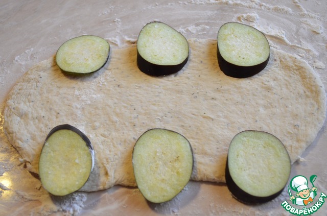Раскатать тесто как указано на фото, выложить баклажаны.