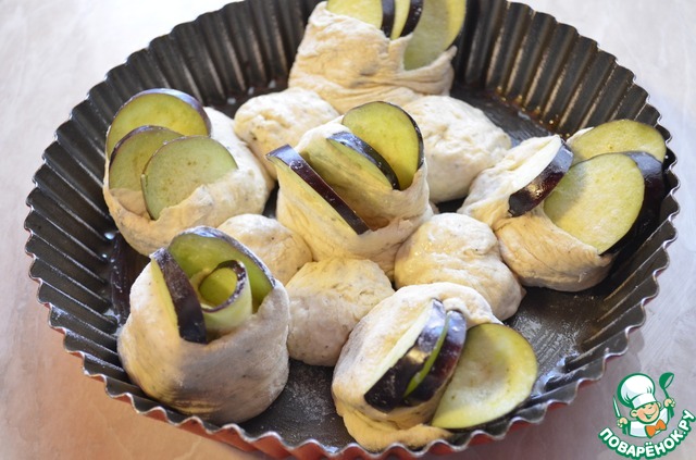 Форму для запекания смазать растительным маслом. Выложить получившиеся рулетики. У меня на 1 часть теста не хватило баклажана, я его скатала в шарики и распределила по форме. Если тесто липнет к рукам, то смажьте руки растительным маслом. Убирает форму в теплое место, накрываем полотенцем, ждем, чтобы тесто поднялось, около 30 минут. Выпекаем хлеб в предварительно разогретой духовке до 180 градусов 40 минут.