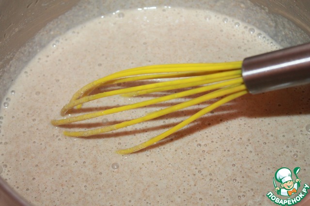 Смешать 100 гр. ржаной муки, горячую воду и дрожжи, поставить в теплое место для разжижения на 20 минут.
