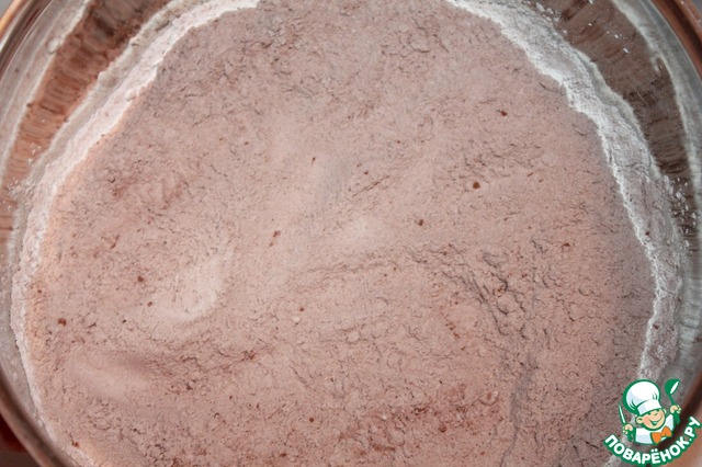 В емкость положить оставшуюся ржаную муку, пшеничную муку, соль, какао и все перемешать. Добавить разжиженную закваску, мед, растительное масло.