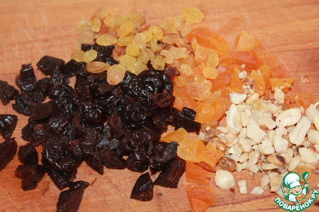 Курагу, чернослив режем на 4 части каждую. К тесту добавляем курагу, чернослив, изюм и и измельченные орехи.