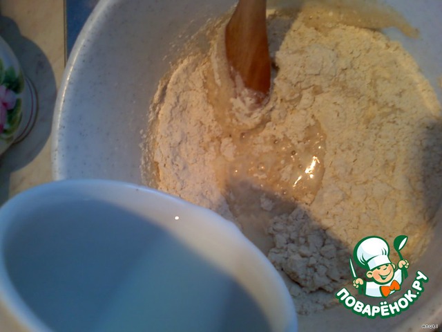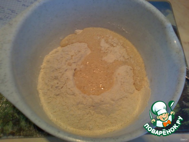 Делаем углубление в середине муки и выливаем туда опару! Пусть постоит, пока мы будем делать пахту.