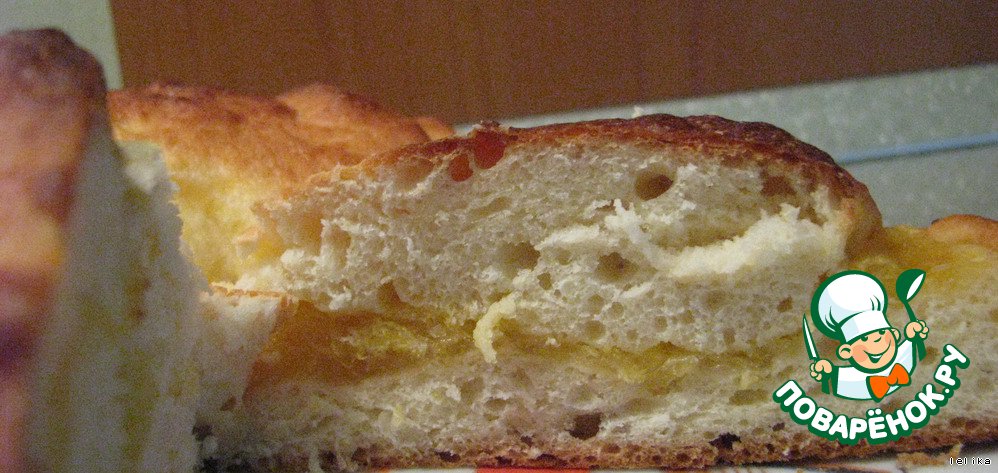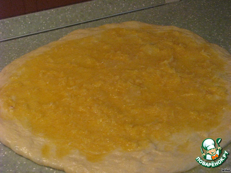 Раскатать тесто толщиной примерно 2 см и выложить начинку.