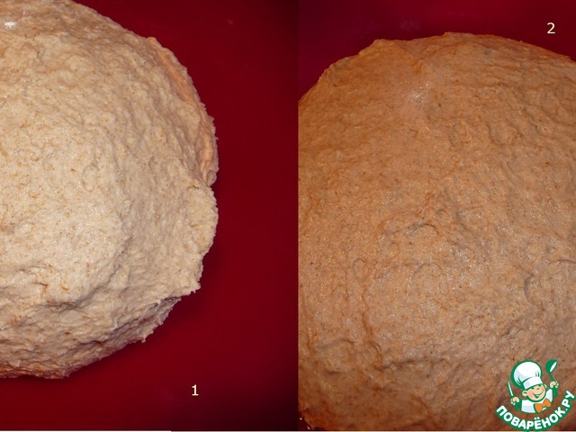Тесто округлить, выложить в смазанную растительным маслом миску (1), накрыть и оставить в тепле на 1.5 – 2 часа для подъема (2).