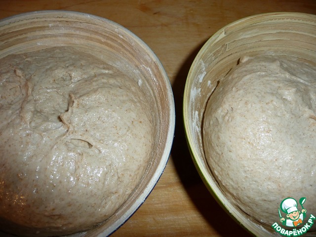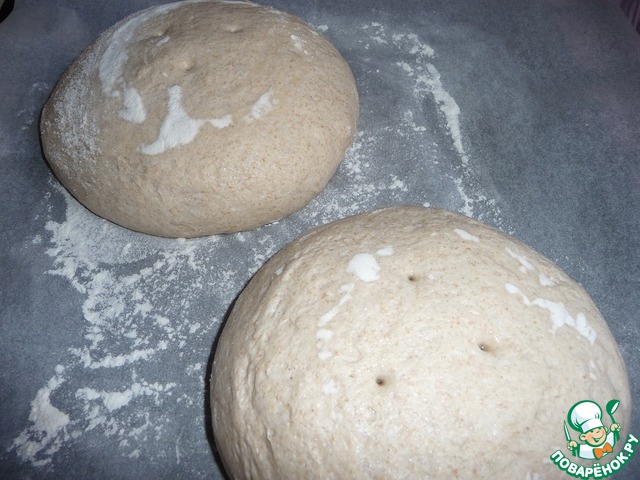 Подошедшее тесто подмесить и сложить конвертом. Готовое тесто выложить на подпыленные мукой формочки, накрыть пленкой и оставить для подъема. Если нет формочек, тесто выложить на пекарскую бумагу, подпыленную мукой и сформировать хлеб желаемой формы.