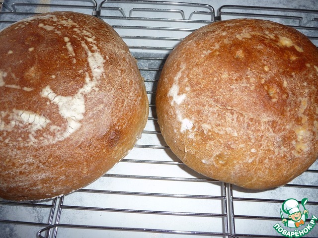 Выпекать в предварительно разогретой до 230С духовке на пару (одновременно с противнем ставим вниз миску с кипятком). Перед посадкой в печь хлеб сбрызнить холодной водой. Через 10 минут выпекания, вынуть миску с кипятком и снизить температуру до 200С. Выпекать 40 мин., ориентируйтесь на свою духовку. Готовый хлеб выложить на решетку и оставить до теплого состояния, затем прикрыть полотенцем.