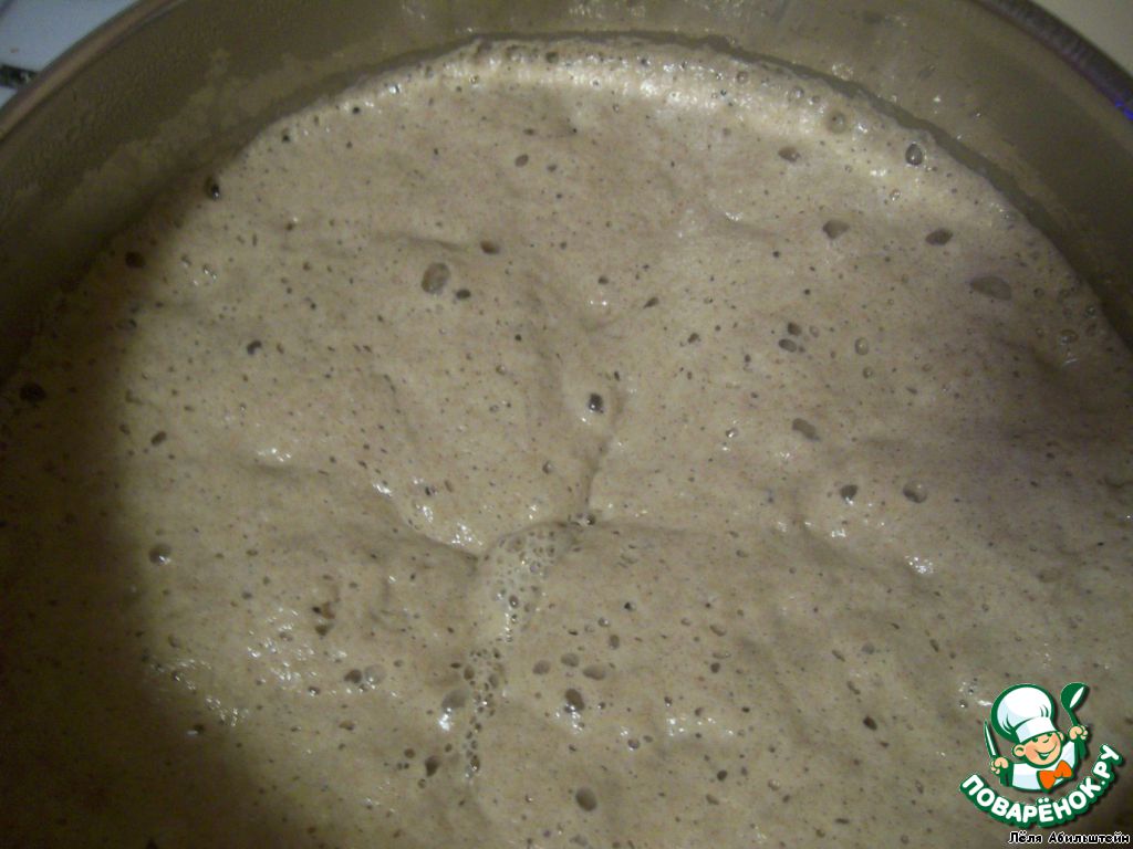 Добавляем туда дрожжи и 1 ст.л. сахара, хорошенько перемешиваем, чтобы дрожжи, так сказать, разошлись. Затем добавляем ржаную муку, тщательно перемешиваем, накрываем крышкой и ставим в теплое место минимум на 8 часов. Я ставлю опару на ночь около батареи.