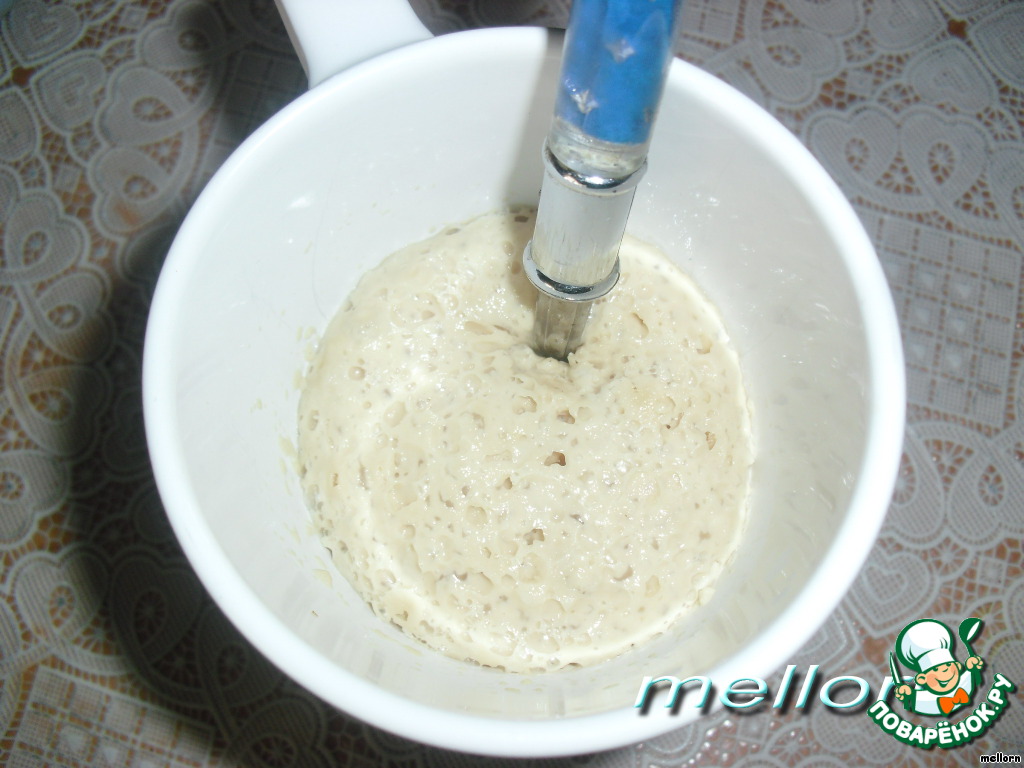 Примерно в 50 мл воды и 1 чайной ложке сахара развести дрожжи. Дать подняться.