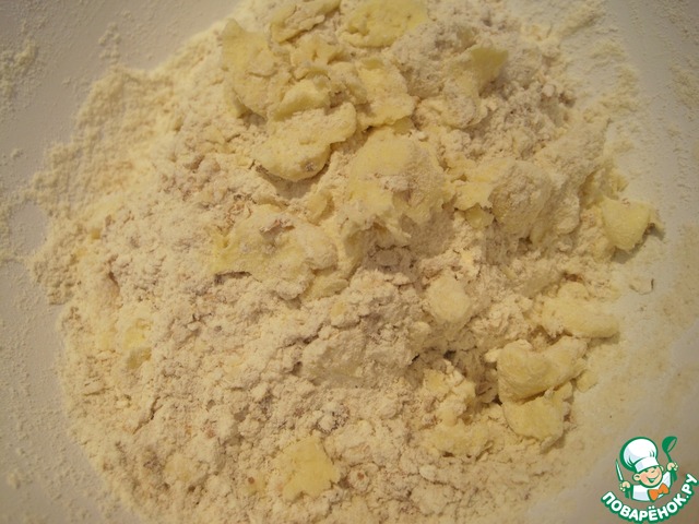 Мелко рубим холодное сливочное масло и смешиваем с мучной смесью. Масло в тесте должно оставаться мелкими кусочками, что бы в процессе выпечки тесто слоилось.