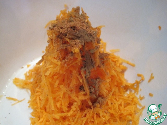 Морковь моем-чистим, натираем на мелкой тёрке. Если очень сочная, то немного отжимаем. Добавляем пряности. Все ингредиенты смешиваем до однородности. Тесто долго месить не надо, что бы оно не утратило своей слоистости. В работе тесто неудобное, липкое.