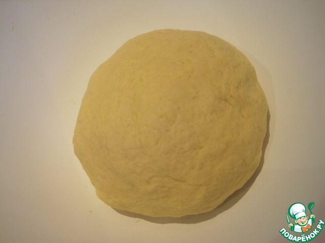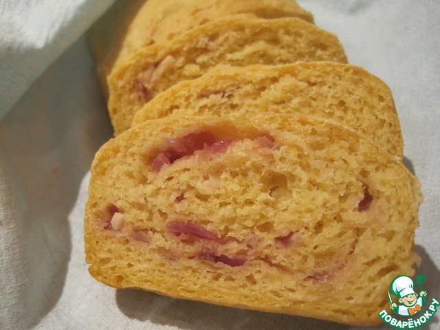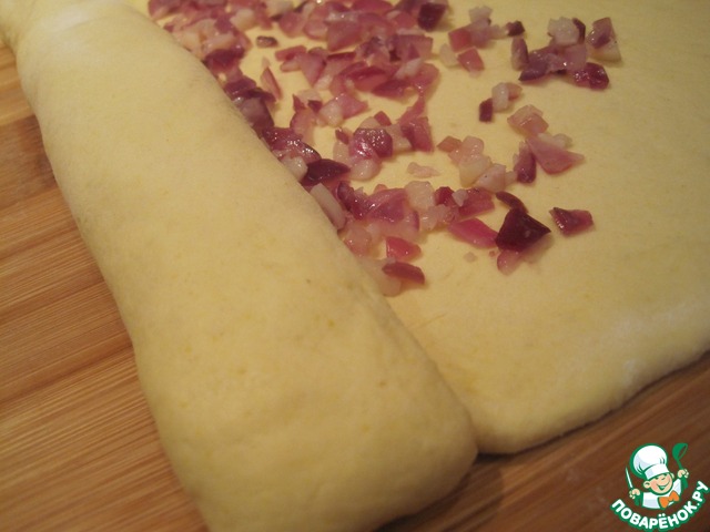 Распределим на тесте чесночно-луковую смесь и завернём тесто в рулет, скрепляя бока, что б начинка не вывалилась.
