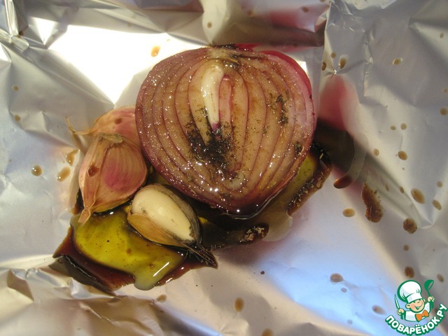 А пока займёмся начинкой. На фольгу положим неочищенные лук и чеснок, сбрызнем оливковым маслом и бальзамическим уксусом, мне захотелось добавить тимьян. Фольгу заворачиваем и отправляем в мультиварку примерно на 15-ть минут. Режим "Выпечка" (на дно чаши я налила немного воды). После запекания фольгу развернём (аромат будет необыкновенный!) и даём остыть. Можно запечь овощи в духовке на противне, но следим, что б овощи не сгорели.