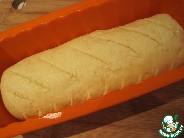 Рулет перенесём в форму, сделаем надрезы острым ножом, при желании можно посыпать будущий хлеб мукой ( я этого не делала), накроем и оставим в тёплом месте для расстойки на 25-30 минут. Духовку включаем для разгорева t 200 градусов.