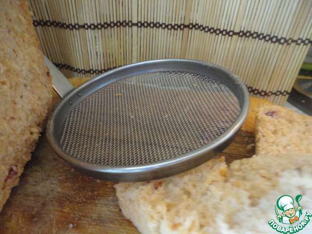 Чеснок мелко рубим ножом. Помидоры режем полосками и обваливаем в муке, чтобы они хорошо вмешались в тесто, а не слиплись одним куском. Когда хлебопечь даст сигнал к закладке добавок (обычно это минут 20 после начала замеса) - добавляем. В моей хлебопечи есть специальный диспенсер, который добавляет автоматически. Очень удобно, если ставишь хлеб с вечера с задержкой так, чтобы утром был готов. Готовый хлеб остудить в течение 30 минут на решетке. У меня решетки нет, я использую такой вот неглубокий дуршлаг.