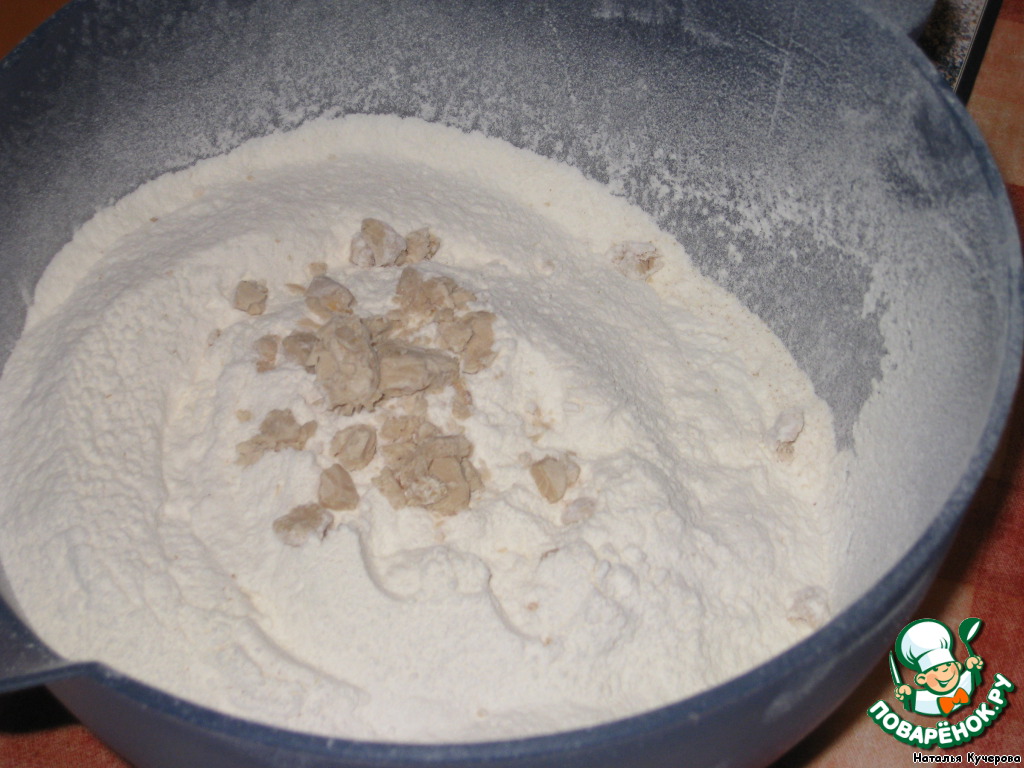 Смешать оба вида муки и пальцами втереть в смесь дрожжи до образования мелкой крошки.