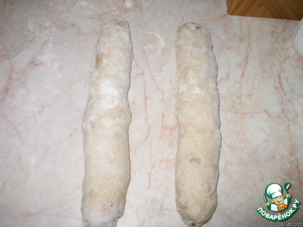 Подпылить рабочую поверхность мукой. Разделить тесто на 2 равные части и сформировать из каждой батон. А именно: основанием ладони расплющить шар теста в круг. Загнуть сначала верхнюю, а затем нижнюю треть теста к центру и как следует прижать. Сложить пополам вдоль и запечатать края.