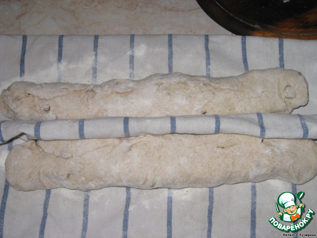 Положить чистое полотенце, посыпать его обойной мукой. Сделать в центре полотенца складку и выложить батоны гладкой стороной вниз по обе стороны от складки. Накрыть вторым полотенцем и оставить на 1 - 1 1/4 часа или пока батоны не увеличатся вдвое.