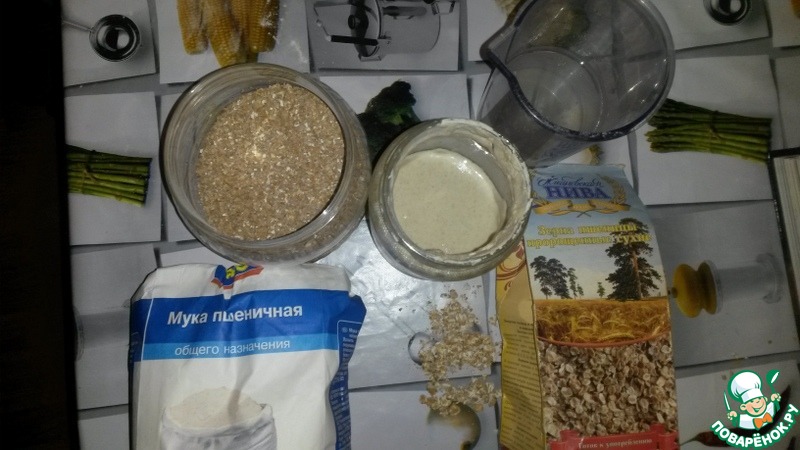 В принципе, набор очень простой. У нас в магазине продают вот такие замечательные пророщенные зерна пшеницы, высушенные и расплющенные. Рецепты закваски есть на нашем сайте. Я вырастила свою закваску на сусле, оставшейся от белого кваса. И она, пока, для меня, самая удачная и сильная.