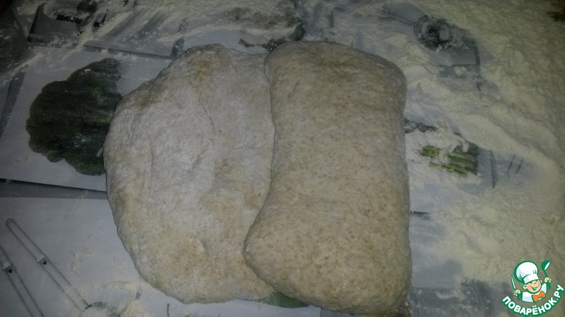 Когда тесто выбродило, выложите его на подпыленную поверхность и расплющите в длинный пласт, ширина которого должна быть чуть меньше длины формы.
