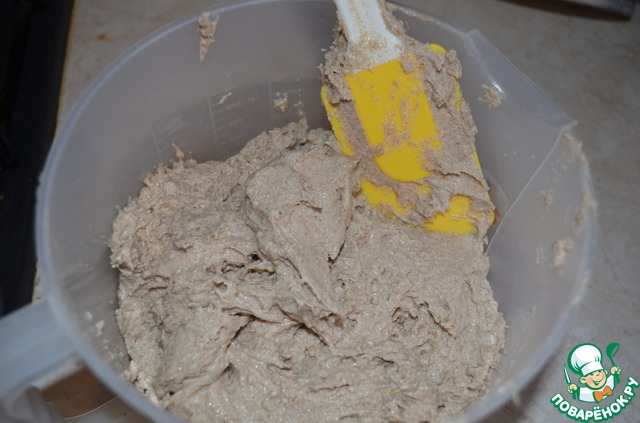 Утрамбуйте его лопаточкой в шар, затяните миску пленкой и оставьте для брожения на 1-1.5ч