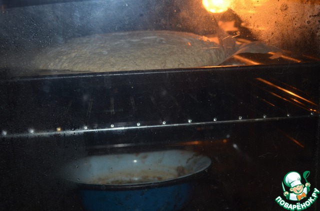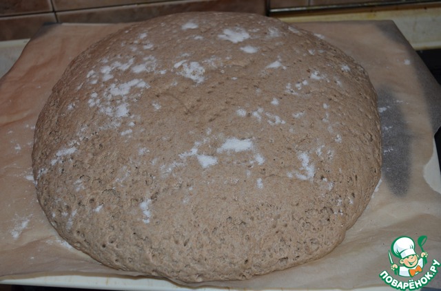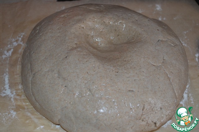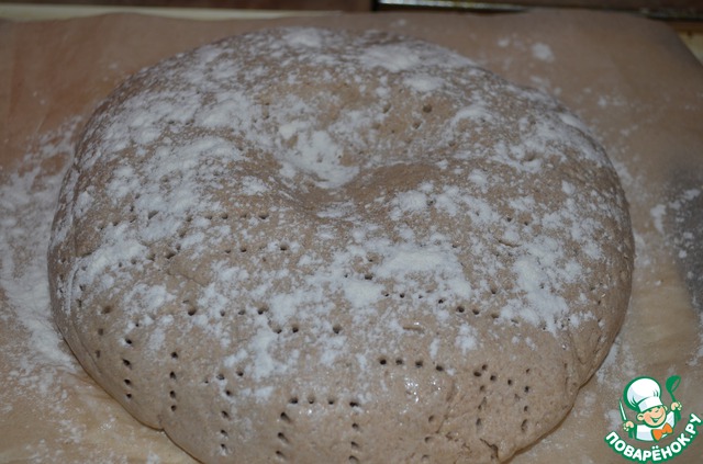 В центре-по желанию-сделайте углубление (диаметра в 6см). Проткните поверхность заготовки вилкой и посыпьте ржаной мукой (либо-отрубями). Остаьвте подходить часа на 1,5 до увеличения в объеме примерно в 1,5 раза. Поверхность хлебушка начнет покрываться трещинками