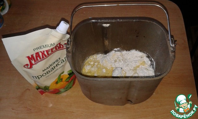Дрожжи, муку (пшеничную и кукурузную), соль, сахар, майонез и воду закладываем в ведерко хлебопечки на режим "Тесто".