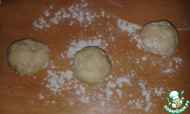 Тесто готово, оно мягкое и пластичное, приятного золотистого цвета. Разделим его на три части.