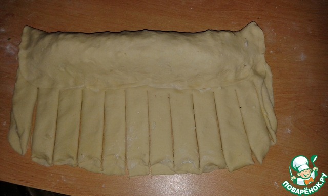 Ту половинку, которая осталась без начинки режем до серединки полосочками пример 2.5 см шириной.
