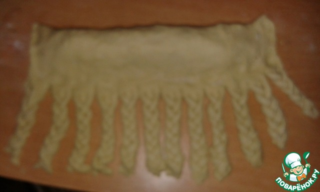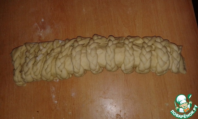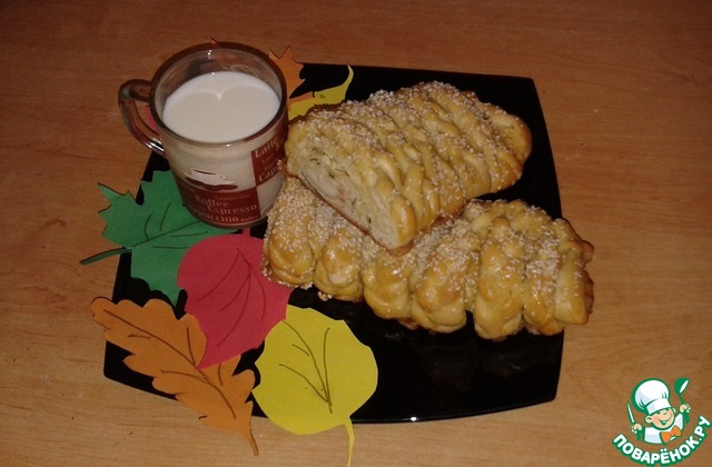 Каждой косичкой "обхватываем" наш хлебушек, даем ему постоять, затем смазываем яйцом, посыпаем кунжутом и отправляем в духовку при 175 градусах примерно на 25 минут.