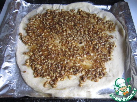 7. Первую часть обмять и раскатать лепешку толщиной примернов 1 см. Разместить ее на смазанном противне.
