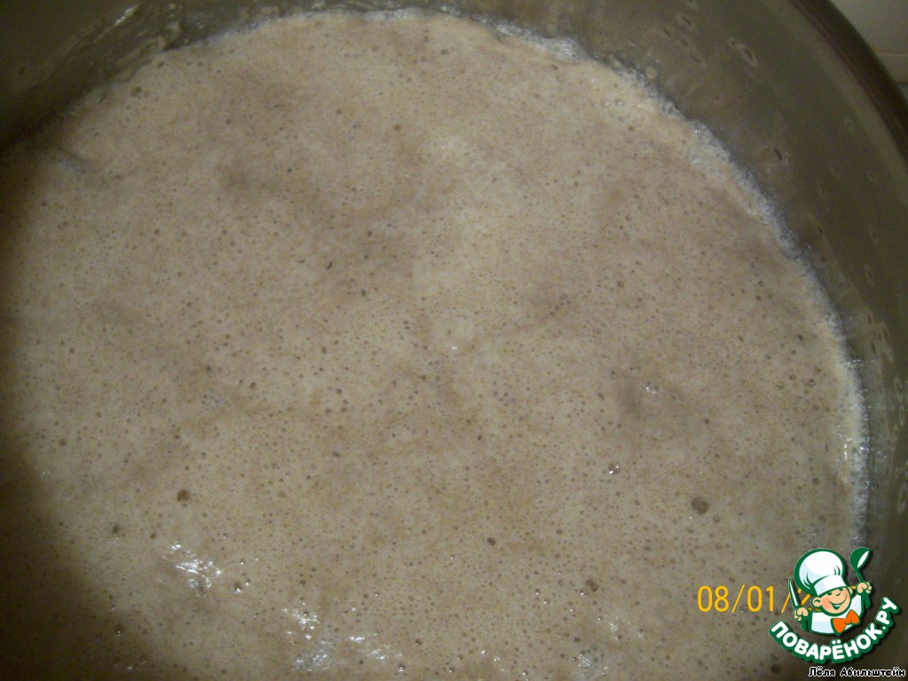 В теплую сыворотку добавить дрожжи, сахар и 1 стакан ржаной муки. Закрыть емкость крышкой и оставить минут на 40 бродить.