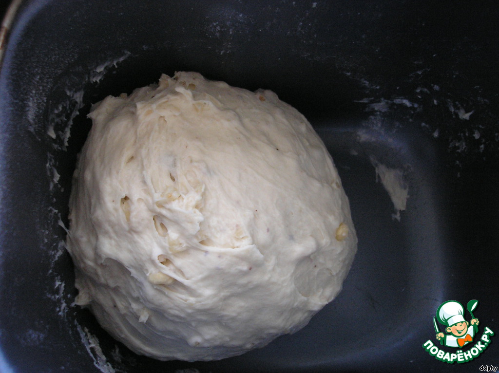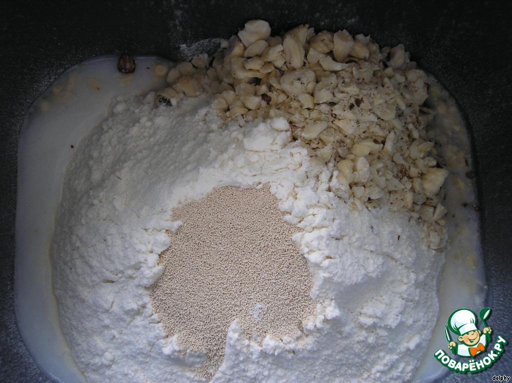 Загрузите все ингредиенты в форму для выпечки согласно инструкции к вашей ХП. В моем Мулинексе последовательность такова: вода, простокваша, соль, сахар, просеянная мука, фундук, дрожжи.